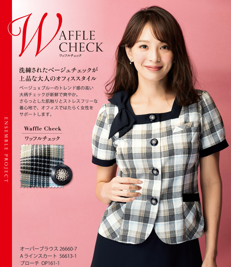 ワッフルチェック事務服の正規通販。新作のワッフルチェック事務服コレクションを1着より格安価格で全国にお届け致します。法人様、個人様、お電話も大歓迎!無料サンプル貸出中です。